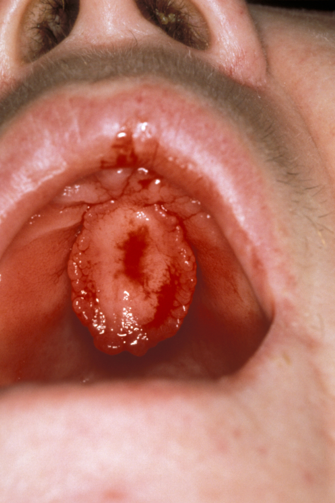 This is a benign but excessive response to low-grade recurrent trauma. These lesions may be sessile or pedunculated and can range from very small lumps looking like a genuine polyp in the cheek to lesions which can cover the entire palate (‘leaf fibroma’, see Figure 1).