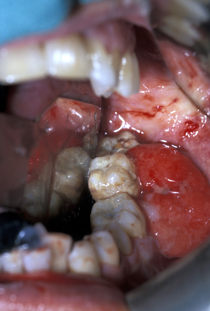 This is a very vascular gingival swelling and is probably caused by chronic irritation (see Figure 3). Histological examination demonstrates multinucleate giant cells in a vascular stroma.