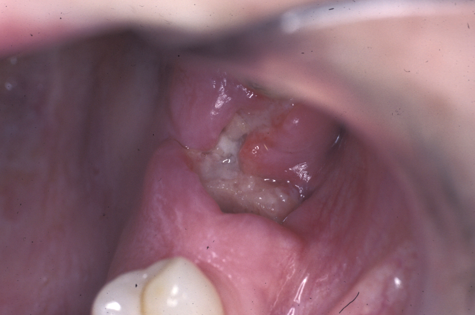 A torus is a bony exostosis (outgrowth) of the jaw. Torus palatinus occurs in the centre of the hard palate (see Figure 9), torus mandibularis occurs in the lingual (tongue-side) premolar or molar region of the mandible (see Figure 10). These lesions are entirely benign and only require removal when they are symptomatic or for reasons of prosthetic functionality.