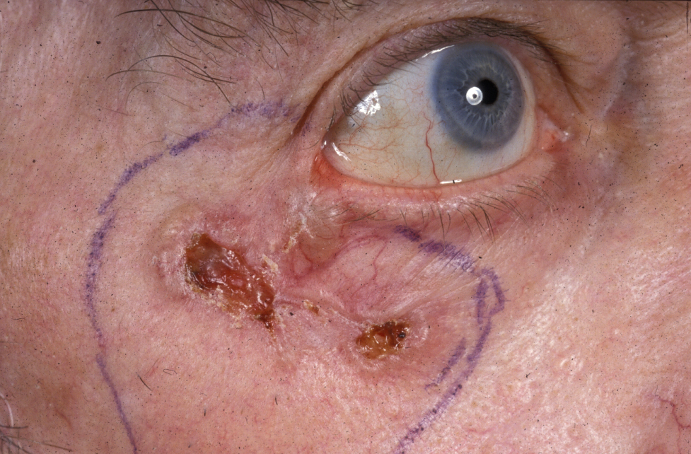 Numerous types of basal cell carcinoma, BCC are described clinically and pathologically (nodular, cystic, pigmented, morphoeic (infiltrative) and ulcerated) but the most important feature is that of margin definition: clearly or ill defined (see Figure 1 and Figure 2). The latter are more clinically dangerous as infiltration can extend far beyond the visible margins.
