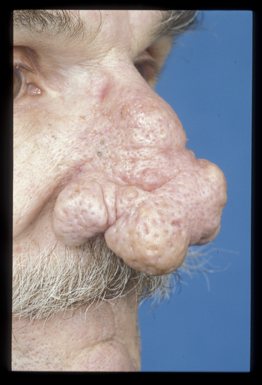 Rhinophyma is a condition caused by an overgrowth of sebaceous glands in the nasal skin (see Figure 1). The perception that it is due to excessive alcohol intake is erroneous. It can be quite dramatic in appearance but is relatively easily treated. The tissue can either be excised or dermabraded (see above). Mechanical removal may be used in conjunction with a CO2 laser. The tissue should be sent for histology as basal cell carcinoma may mimic benign rhinophyma.
