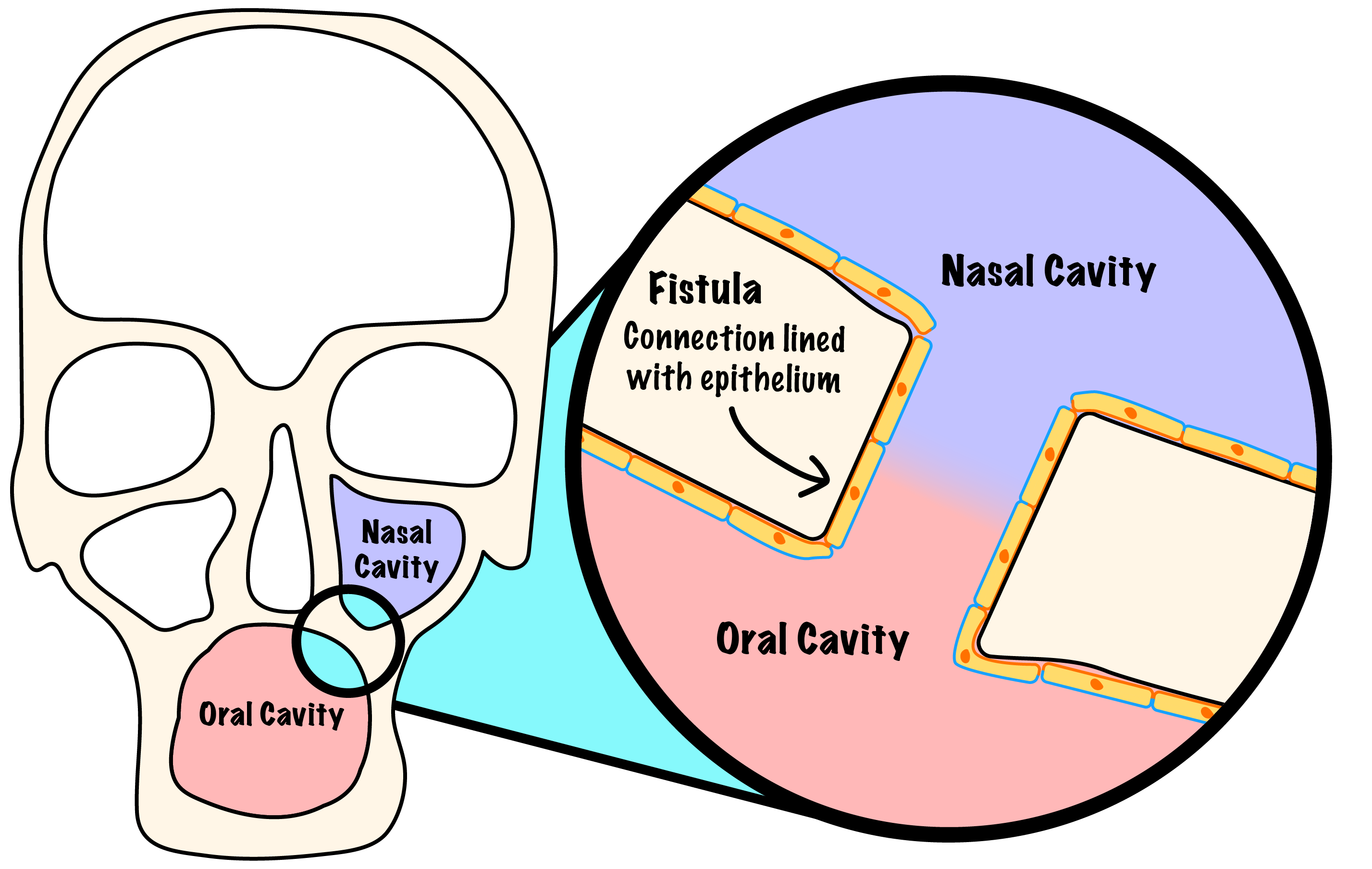 A fistula is a communication, an abnormal connection between hollow organs or the body surface. This ‘pipe’ is lined by epithelial cells, like other inner or outer body surfaces. A fistula can occur in every part of the body, the most common locations are the intestines (in particular the bowel), blood vessels, the urogenital tract and the head and neck region. A fistula with only one open end is called a sinus tract. Figure 1 schematically illustrates a fistula connecting the oral and nasal cavities.