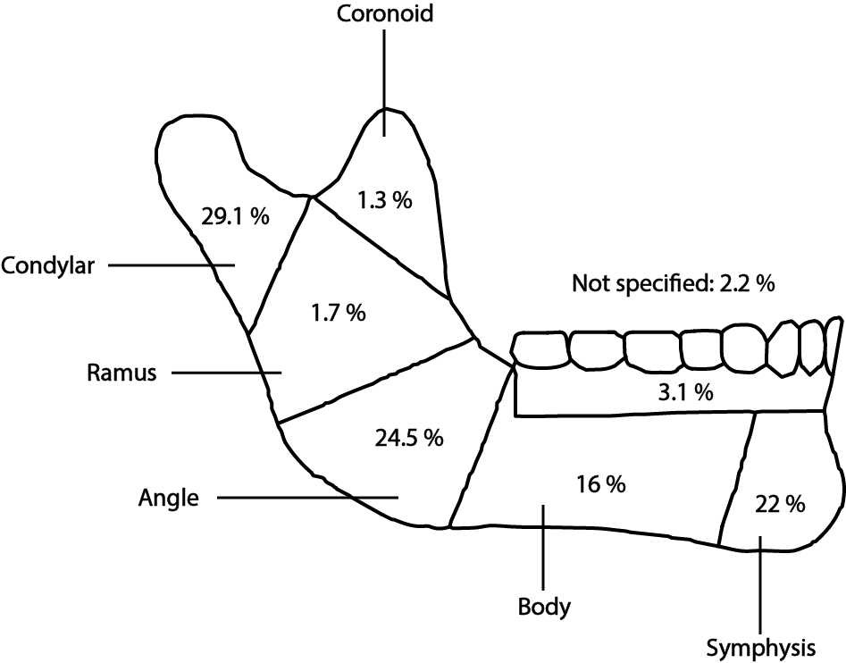 These percentages change with age, as do the specific types of fractures seen between paediatric and adult mandibles and dentate and edentulous mandibles.