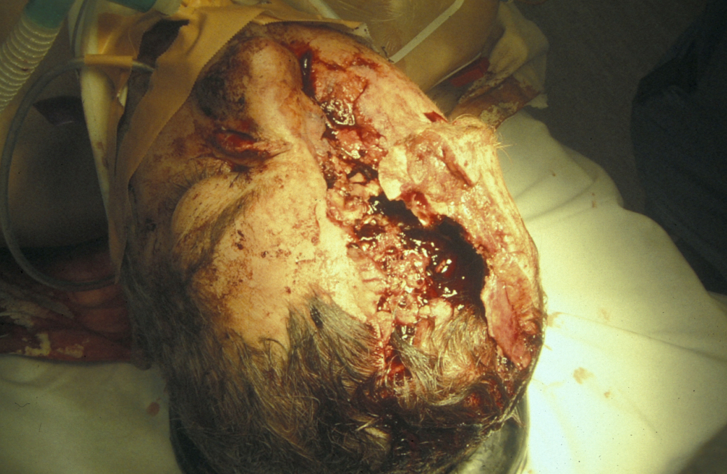 Craniofacial injuries may be associated with a significant head injury. In cases of complex craniofacial trauma overlying soft tissue, skull and brain may be lost (see Figure 13). Rotational flaps, free tissue transfers or tissue expansion may be needed to provide soft tissue coverage and a healthy environment for the rigid protection for the injured brain