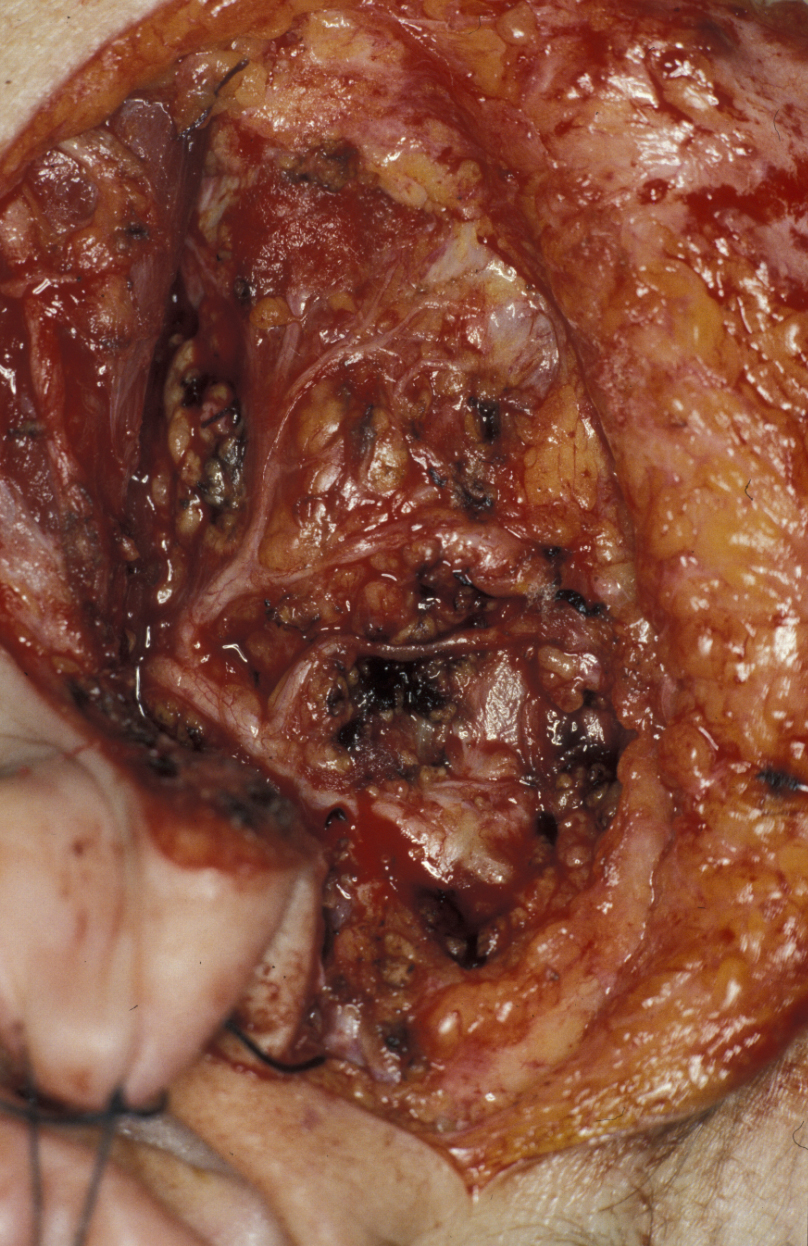 Within the parotid gland, the facial nerve branches into an upper and lower division from which stem the five named major branches. The nerve separates the gland into its superficial and deep lobes (see Figure 2). There is no natural tissue plane here and the nerve should be thought of as being embedded in the substance of the gland. Also within the gland are the retromandibular vein, external carotid artery, lymph nodes and filaments from the auriculotemporal nerve.