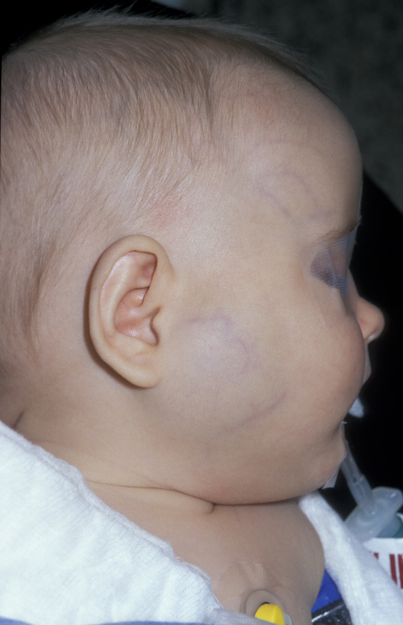 Congenital haemangiomata, which are much rarer than infantile haemangioma, are fully developed lesions at birth and may be of significant size. They tend to occur in the same locations as infantile haemangiomas do, but are microscopically distinct from infantile haemangiomata. There are two types of congenital haemangiomata: those that rapidly involute after birth and typically will have resolved at 12 months of age; and those that do not involute (and some ‘in-between’ varieties with partial involution). Those that do not involute will show no signs of shrinkage at approximately 6 months of age and surgical interventions are often necessary. Apart from this, all other considerations for the clinical assessment / diagnosis are the same as for infantile haemangiomata.