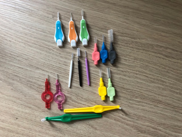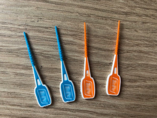 Interdental brushes come in different sizes, size is normally indicated by a colour, and colours change depending on the brand. Handle styles are also different according to brand (Figure 6).