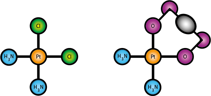 Figure 1 shows a sketch of two drug molecules commonly used in chemotherapy: cisplatin and carboplatin. Both are drugs that target genetic material in a living cell.