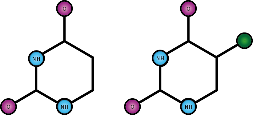 Methotrexate and 5-fluorouracil are chemotherapy drugs that belong to the class of drugs known as antimetabolites. By closely mimicking molecules that are ordinarily consumed by the normal healthy cell cycle, these substances prevent the cycle from continuing and so induce apoptosis. Antimetabolites typically differ only very slightly in their molecular composition and structure from the molecules ordinarily used by the cell (see Figure 3). Yet these minute differences are enough to prevent normal cell function. As can be seen in Figure 3, the normal natural substrate uracil (left) differs from the chemotherapy drug molecule 5-fluorouracil (right) by just having replaced one H atom by a fluorine atom. Uracil is one of the four building blocks of RNA.