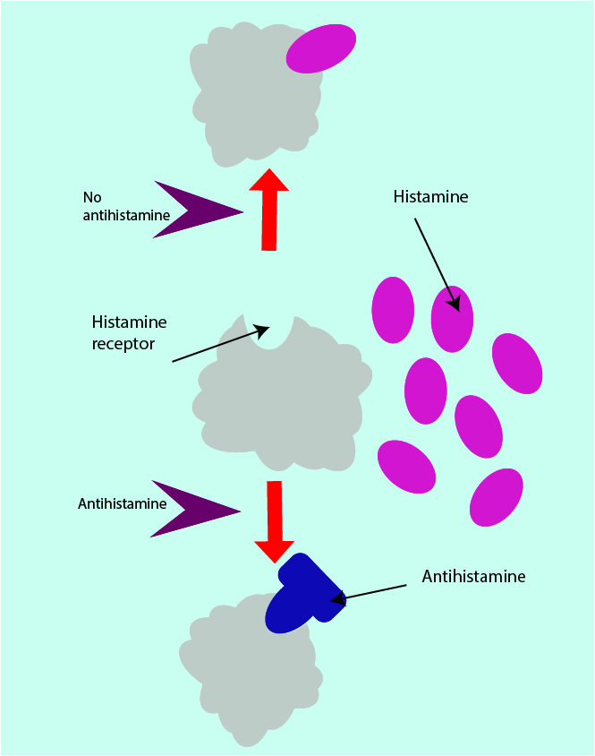 Most antihistamines designed to reduce the effects and symptoms caused by histamine release do so by blocking the histamine receptors (called histamine-1; see below) so that the allergic reaction stops at that stage. This is schematically illustrated in Figure 2.