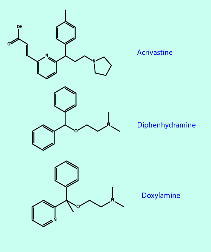 There is a large number of substances with antihistamine properties, interacting with and hindering the histamine-1 receptor sites. Acrivastine, diphenhydramine and doxylamine (see Figure 3) are long-established such antihistamines.