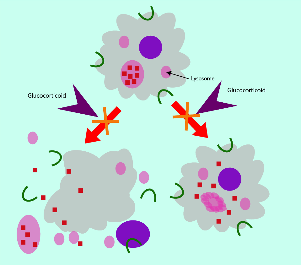 At the cellular level as part of their anti-inflammatory properties, glucocorticoids stabilise the membranes of lysosomes. This prevents the release of aggressive hydrolytic enzymes into the cytoplasm of the cell and ensures continued normal function of the cell. In addition, glucocorticoids also stabilise the outer membranes of the various types of white blood cells, preventing rupture of cells. Glucocorticoids regulate the permeability of capillaries so that an overactive immune response is curbed because white blood cells remain contained in the blood vessels. Glucocorticoids further prevent phagocytes and leukocytes (types of white blood cells which kill and digest pathogens) from accumulating. By inhibiting phagocytosis (the engulfment of pathogens) as well as decreasing the amount of antibody formation (in response to the presence of a pathogen) the immune response is reduced.
