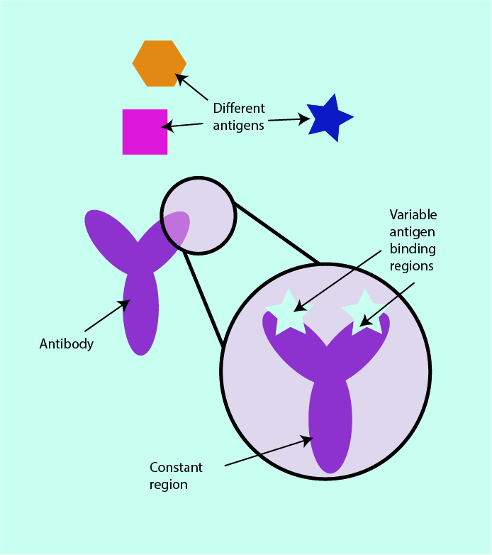 The first of these responses is called a humoral response. A humoral response is an immune system activity involving extracellular fluids (body fluids) and complements the intracellular immune responses. B cells (another subtype of white blood cells) produce specific molecules, called antibodies. These are proteins which are very specifically matched to the shape of the corresponding antigen. Antibodies have constant regions which are very similar in all antibodies and variable regions which are different for different antibodies and allow specific binding to ‘their’ matched antigens (see Figure 10). This mechanism is often referred to as antibody-mediated immune response.