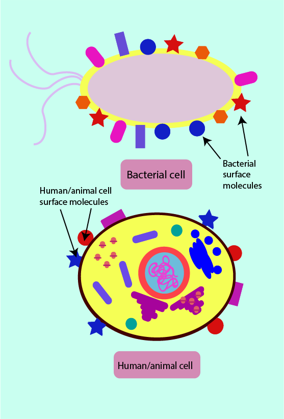 Phagocytes can distinguish between pathogenic cells and human host cells due to some differences in the molecules present on the surface of human cells. On host cells there are often no surface molecules which are complementary (able to fit together) to the phagocytic cell surface receptors. Sometimes surface molecules present on a pathogen may be only slightly, but significantly, different from those on a human host cell. This is schematically illustrated in Figure 3. This distinction is vital so that host cells (often called self-cells) do not stimulate an erroneous immune response, targeting the host. Similarly, it is important that under normal circumstances an immune response is not triggered by the presence of the host’s commensal (friendly) microorganisms.