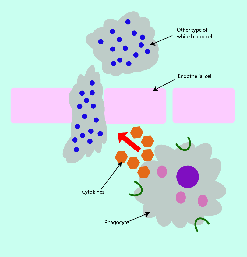 Phagocytes can produce further types of messenger proteins, such as cytokines that make it easier for some helpful white blood cells to pass from the blood in capillaries (small blood vessels) into infected tissue via endothelial cells (cells which line the capillaries). This type of cytokine achieves this effect by increasing the gaps between endothelial cells (vasodilation; see Figure 7 for a schematic illustration). The movement of the white blood cells from the capillaries into surrounding tissues is termed extravasation.