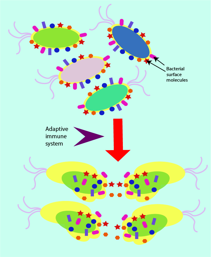 The adaptive immune system does not focus on the broad and rapid identification of the presence of pathogens in general, but rather it is able to recognise (and remember) a very large number of molecules, representative of a particular pathogen. This specific recognition is biochemically processed in order to produce an immune response specific to the particular pathogen. It is important that the adaptive immune response is as efficient as possible, it is the last line of defence available to the body against infection. Figure 8 symbolises the specific actions of the adaptive immune system (compare Figure 1, symbolising the general actions of the innate immune system).