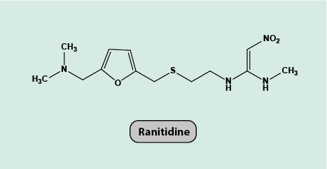 H2 receptor antagonists reduce the production of gastric acid by competing with the histamine receptor in gastric cells by binding to this receptor and thus blocking it for histamine. Histamine, alongside food and insulin, triggers the release of gastric acid, hydrochloric acid (HCl), when binding to the H2 receptor. By blocking this histamine action, the secretion of the volume of gastric acid as well as its acidity are reduced. This is a useful mechanism to allow time for healing of stomach ulcers. Commonly used H2 receptor antagonists are ranitidine (Figure 2) and cimetidine.