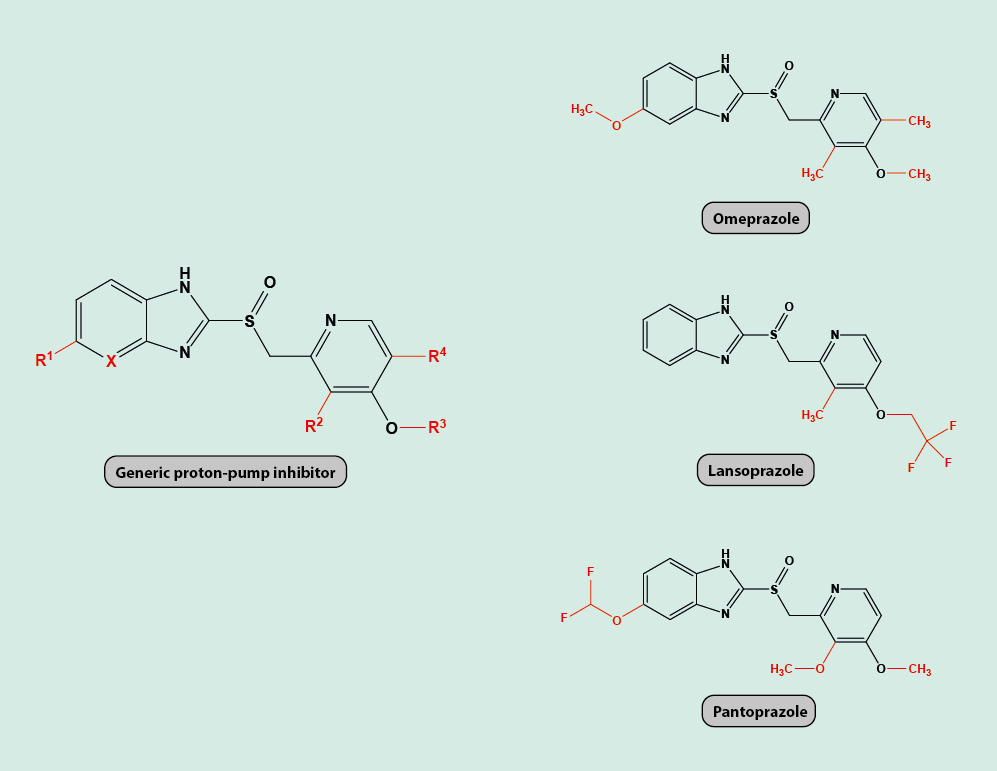 Proton pump inhibitors, PPIs provide a more profound and long-lasting suppression of the secretion of gastric acid (up to 99 %) by irreversibly blocking the enzyme that orchestrates the last stage of gastric acid secretion. This gastric proton pump enzyme, hydrogen/potassium adenosine triphosphate enzyme (H+/K+ ATPase), is very effectively blocked by a particular type of chemical (Figure 3), of which many variations have been developed.