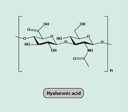 Hyaluronic acid is a component of skin, connective and nerve tissues where it is found in the extracellular matrix (the material surrounding cells) and where it has a number of structural and functional roles, plays a part in wound repair and local immune response and inflammation, and in cell migration (including potential involvement in the metastasis of malignancies). Hyaluronic acid (Figure 1) occurs in the body in the form of highly polymerised, very high molecular weight molecules (the number of repeat units, n (see Figure 1) is such that typical molecular units, depending on the tissue in which the hyaluronic acid is located, will have a molecular mass of several thousand kg/mol). Hyaluronic acid belongs to the chemical class of sugars (carbohydrates; see below), specifically it is a glycosaminoglycan. Hyaluronidase refers to a family of enzymes (catalysts) that are responsible for breaking down polymeric hyaluronic acid molecules during the normal ongoing process of renewal of body components. Hyaluronic acid synthases are a group of enzymes that facilitate the biosynthesis of new polymeric hyaluronic acid in this renewal process.