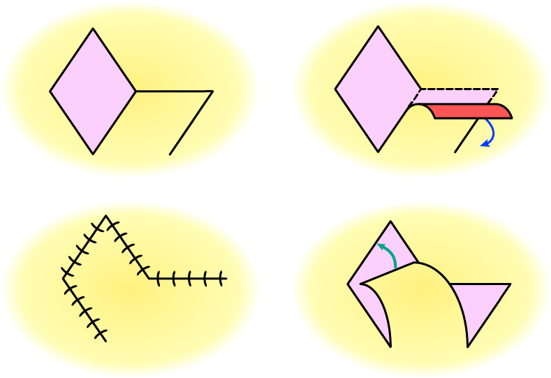 A rhomboid-shaped defect can be covered by a rhomboid flap (Figure 6). The geometry of a rhombus allows for a particularly versatile repair and coverage approach: the defect can be covered by a flap from the direction of any of the four sides of the rhombus. The flap movement involved is a transposition of the raised flap.