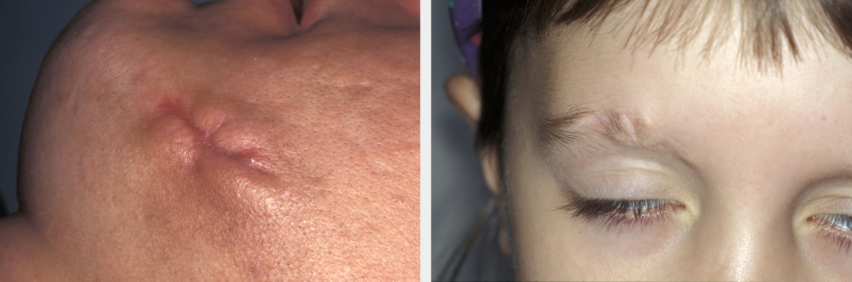 Almost every injury involving a breach of the skin will result in a degree of scarring. In many circumstances, scars are in areas where they will not readily be noticed by other people and therefore they are of little or no consequence. Indeed, even in clearly visible areas, scars are often so fine as to be barely noticeable, or may be disguised within the natural skin creases or relaxed skin tension lines. Elective incisions for surgery are designed such that they respect the relaxed skin tension lines and so produce as minimal scarring as possible. However, trauma has no respect of aesthetics and therefore the scar produced by a trauma wound may prove to be particularly unsightly. Linear wounds tend to develop more obvious scarring than do irregular wounds unless a linear repair eyebrow has been mismatched (see Figure 12. Good wound care, early suture removal, moisturisation and massage all help to reduce scarring.