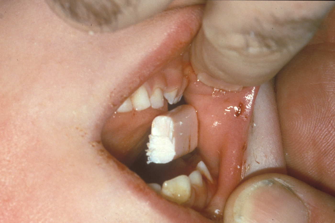- any impacted material can be removed by surgical forceps or with a surgical scrubbing brush, dipped in antiseptic solution