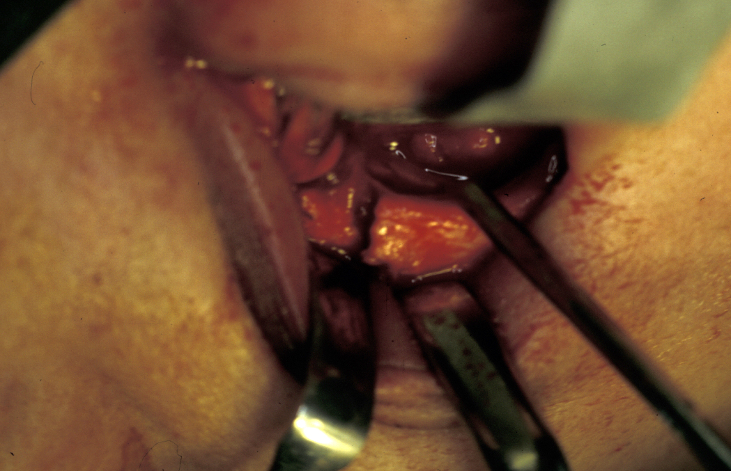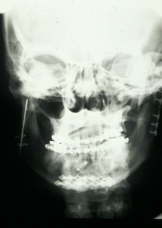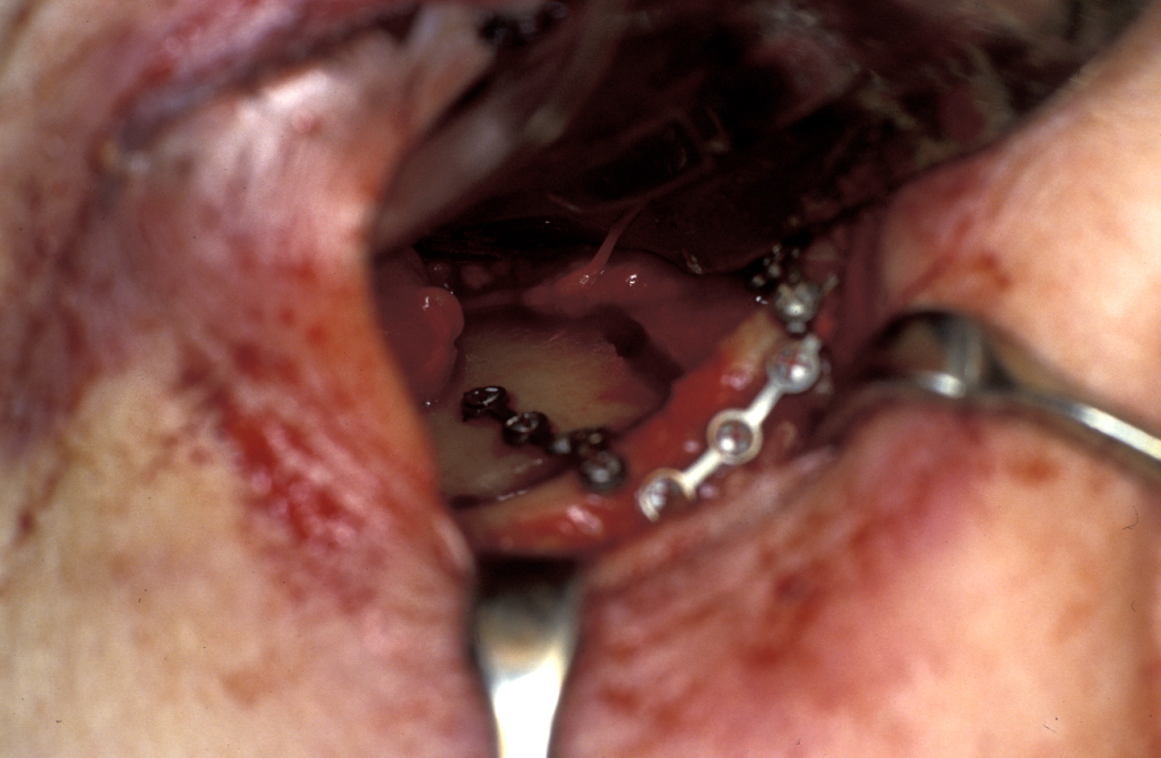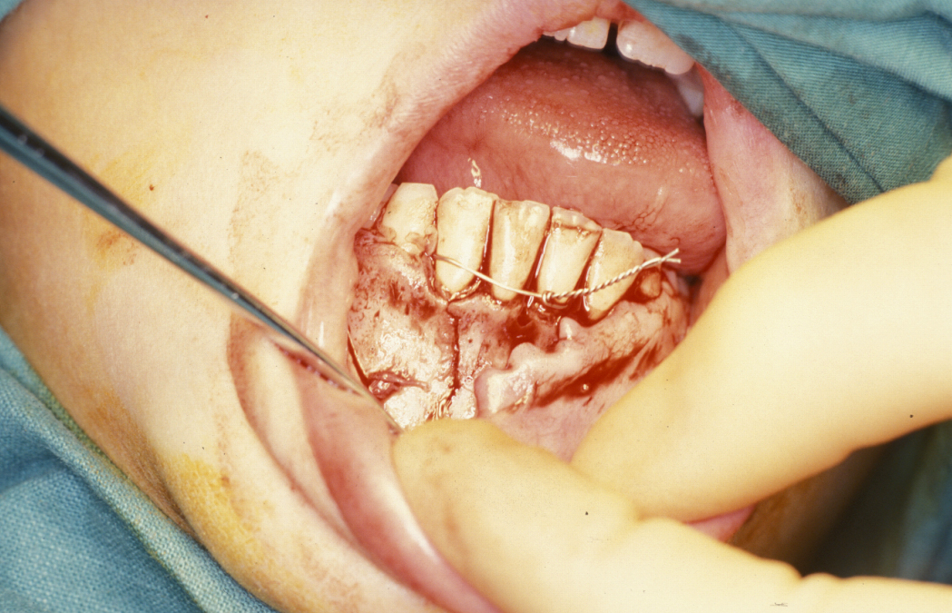 Under direct vision via buccal sulcus incisions (incision in the depression between cheek and arch of jaw) the mandibular fracture is exposed and reduction confirmed (see Figure 3).