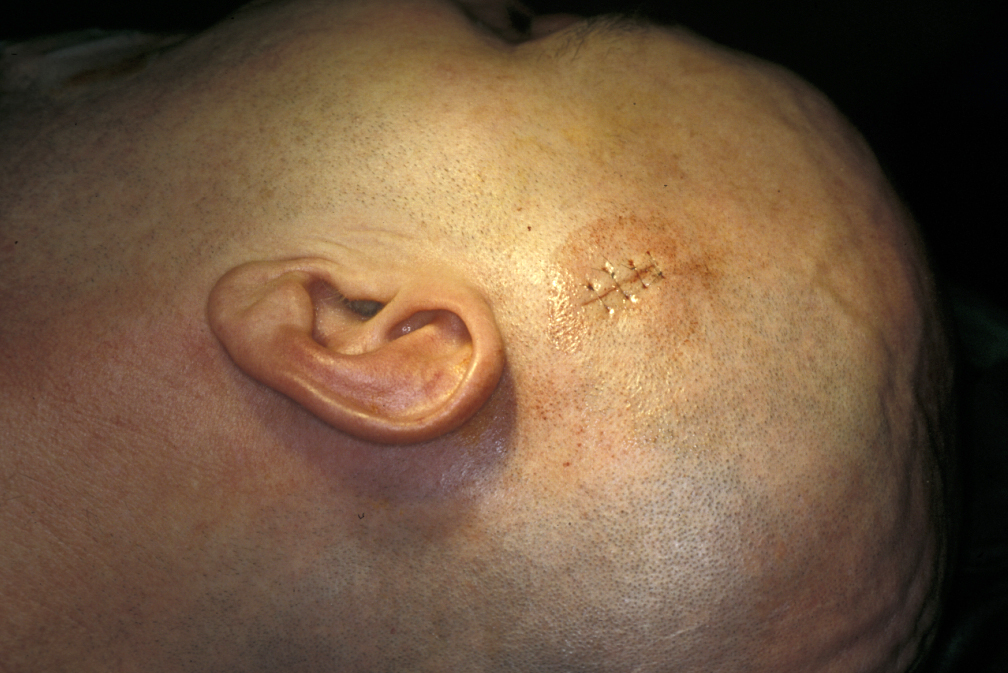 - Temporal approach - the incision is made in the hairline two fingerbreadths above the tip of the pinna (outer part of the ear). Skin, temporoparietal fascia and temporalis fascia are dissected while trying to avoid superficial temporal vessels (but ligation of these, if it happens, is not a disaster). An elevator is inserted just deep to the temporal fascia. It is passed along the lateral surface of the temporalis muscle and enters the natural space beneath the zygomatic arch deep to the zygoma.