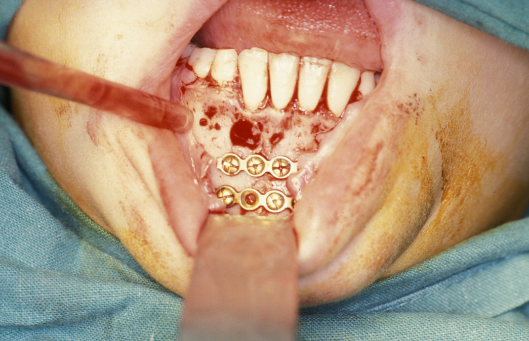Fixation is undertaken with titanium mandibular plates. According to Champy’s principles, in the mandibular symphyseal and parasymphyseal (the middle region of the mandible) region two mandibular plates are required, one just below the level of incisor/premolar apices and above the mental foramen and one as low down on the buccal surface as possible parallel to the lower border of the mandible. This is shown in Figure 4.