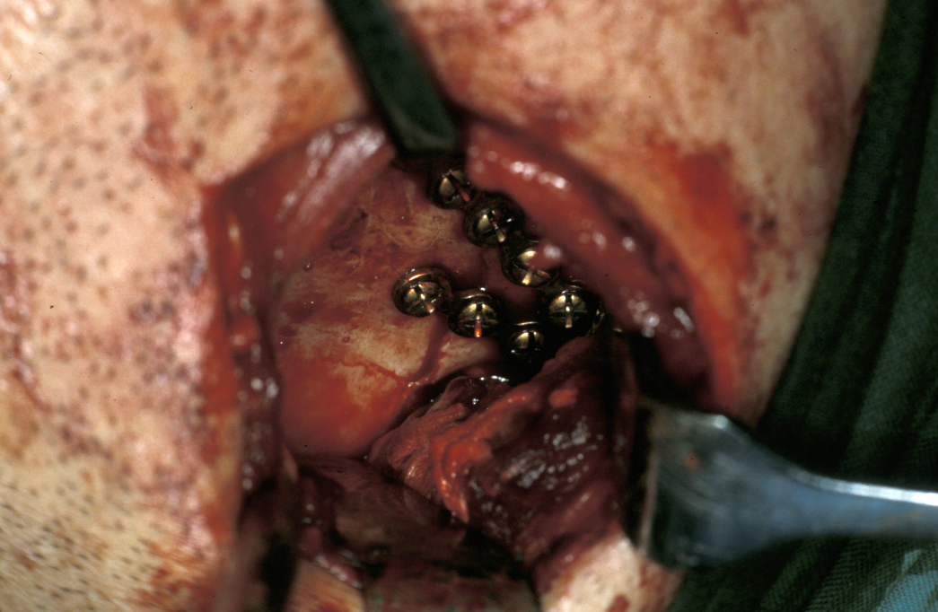 Repair of the frontal bone defect can be achieved with inner table from the cranial vault, fracture fragments, outer table bone graft or free iliac bone. If there has been a substantial degree of bone loss, acrylic plates were popular as a custom made cover for the defect. Alternatively, titanium sheets can be used in the acute setting and cut to shape or fabricated based on CT scans. Several other cranioplasty materials have recently become available (for example, polyarylether-etherketone (PEEK)). Long term follow up involves monitoring for frontal mucocoele development, meningitis, frontal bone deformity, potential infection of the plates and CSF leak.