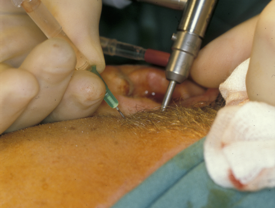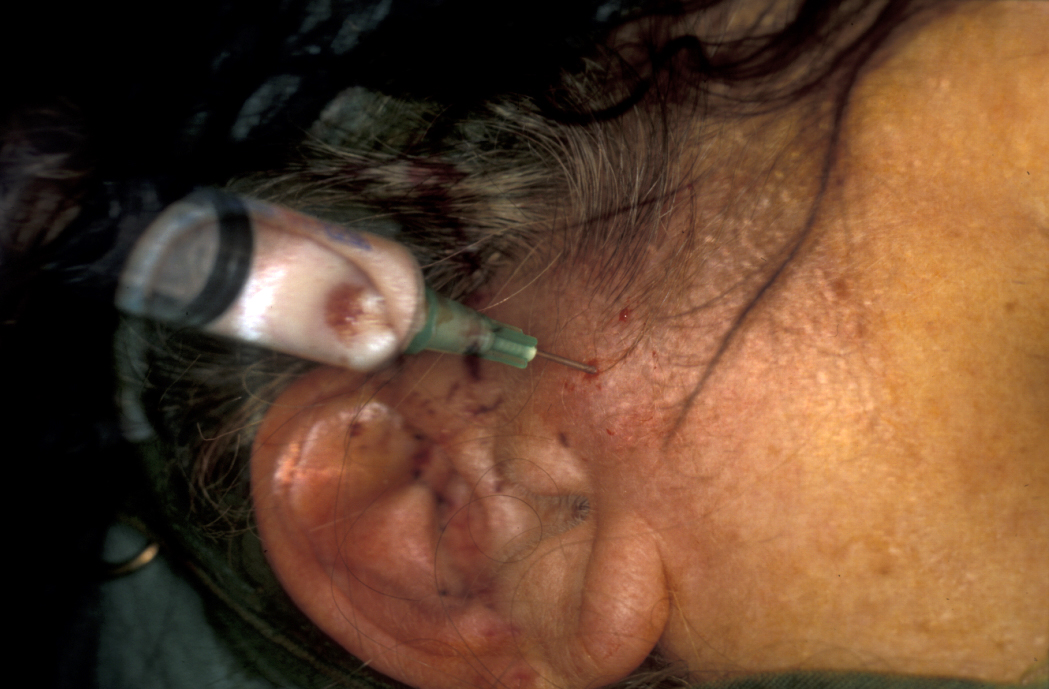 Treatment in the first instance is essentially along the lines of treatment for TMJDS (see above). However, over time the condition may require jaw joint replacement (see below). Steroid (anti-inflammatory) injections into the joint are useful for pain relief, but can damage the articulating surfaces in the joint further and may result in accelerated joint destruction. Injection of a steroid into the lower jaw joint space is shown in Figure 2.