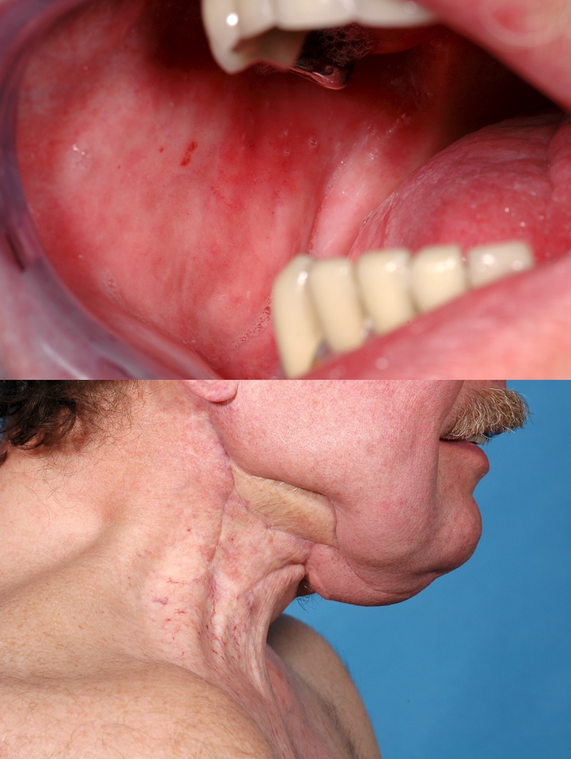 Reconstruction for ORN may require a combination of two different flaps. This is because the residual surrounding soft tissue contains large numbers of cells which have also sustained high-energy radiation damage and when they attempt to heal after surgery, they essentially necrose. This means that the invisible soft tissue future defect must be catered for in treatment planning for ORN. There is no benefit in having a reconstructed lining of the mouth and jaw with a (for example) free fibula flap if the skin coverage then dies. This can appear overly dramatic, but a single, large two-flap operation is often the only way to create a safe healing environment (Figure 4, Figure 5).