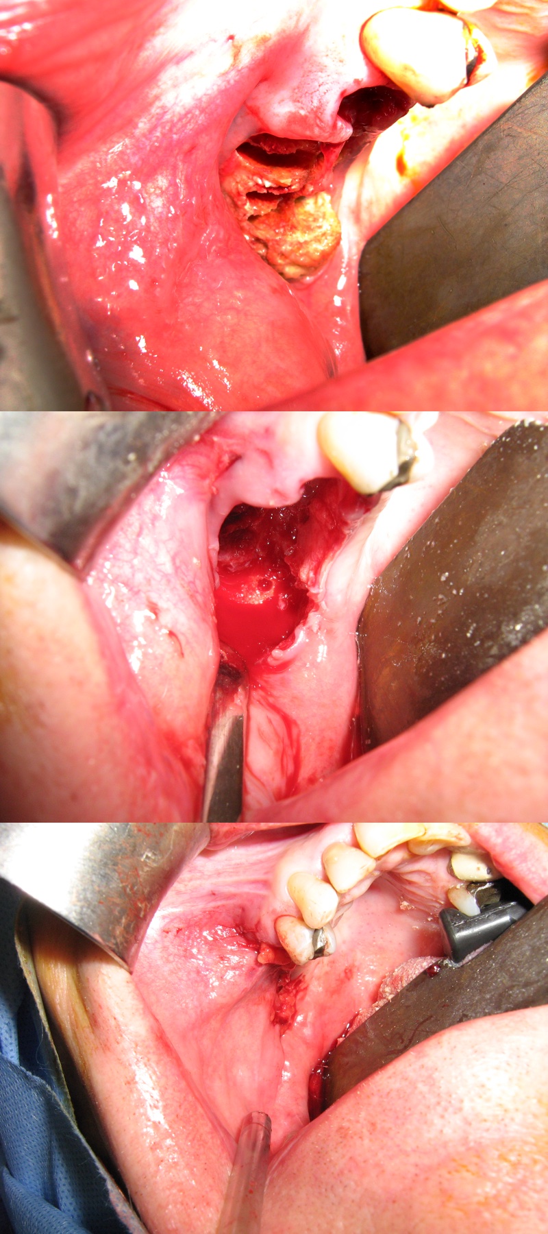 More extensive forms of ONJ require more extensive surgical strategies. These include removal of all necrotic bone (sequestrectomy), smoothing of bone edges, decortication (Figure 2). In some such cases, primary wound closure may still be possible. With increasing defects, it is more likely that vascularised local soft tissue will be needed to provide a local flap for an effective seal. Other possibilities for wound closure are regional or free soft-tissue flaps.