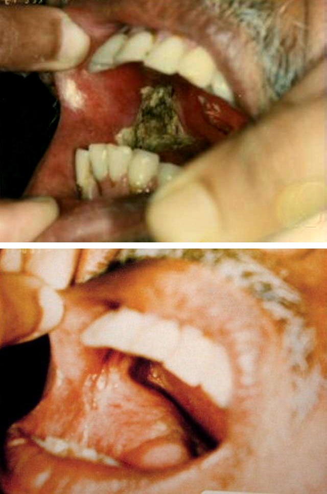 The most suitable treatment protocol depends on cause and extent of the necrosis. Relatively limited necrotic lesions from minor infections or other lesions of the oral mucosa may be treated conservatively. Conservative treatment includes a range of antiseptic mouthwashes, appropriate analgesia and some form of ‘bandaging’ of the oral mucosa by application of a gel that provides a protective thin film as well as some degree of pain relief. Figure 3 shows an example of necrosis of the oral mucosa shortly after photodynamic therapy and after three months.