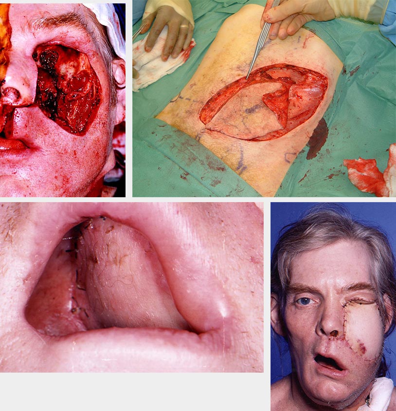 The main requirement for this defect is to obtain closure by covering the area with a pliable lining while allowing for normal mouth opening. Superficial lesions can be excised with a laser and left to heal or repaired with a skin graft. Small deeper defects can be closed with a local flap. A large and deep defect is better repaired with a radial forearm free flap (see Figure 6). Through-and-through defects require bipaddled repair.