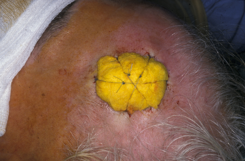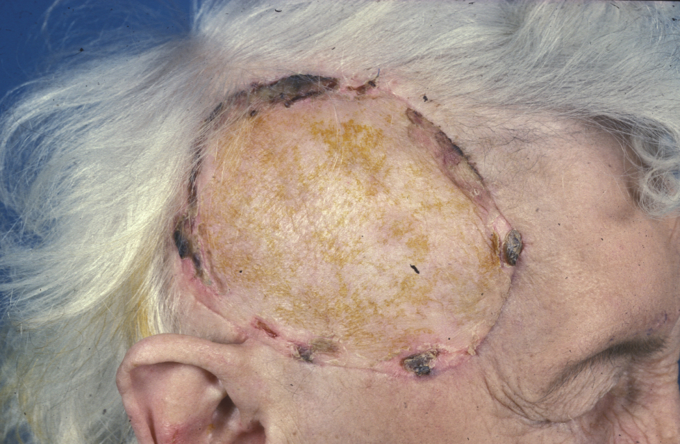 Split-thickness grafts are useful for large defects, particularly of the scalp (see Figure 3). Because these grafts allow more contraction than full-thickness grafts, they must be used with care on the face and close to free margins and are usually the last reconstructive choice in these areas.