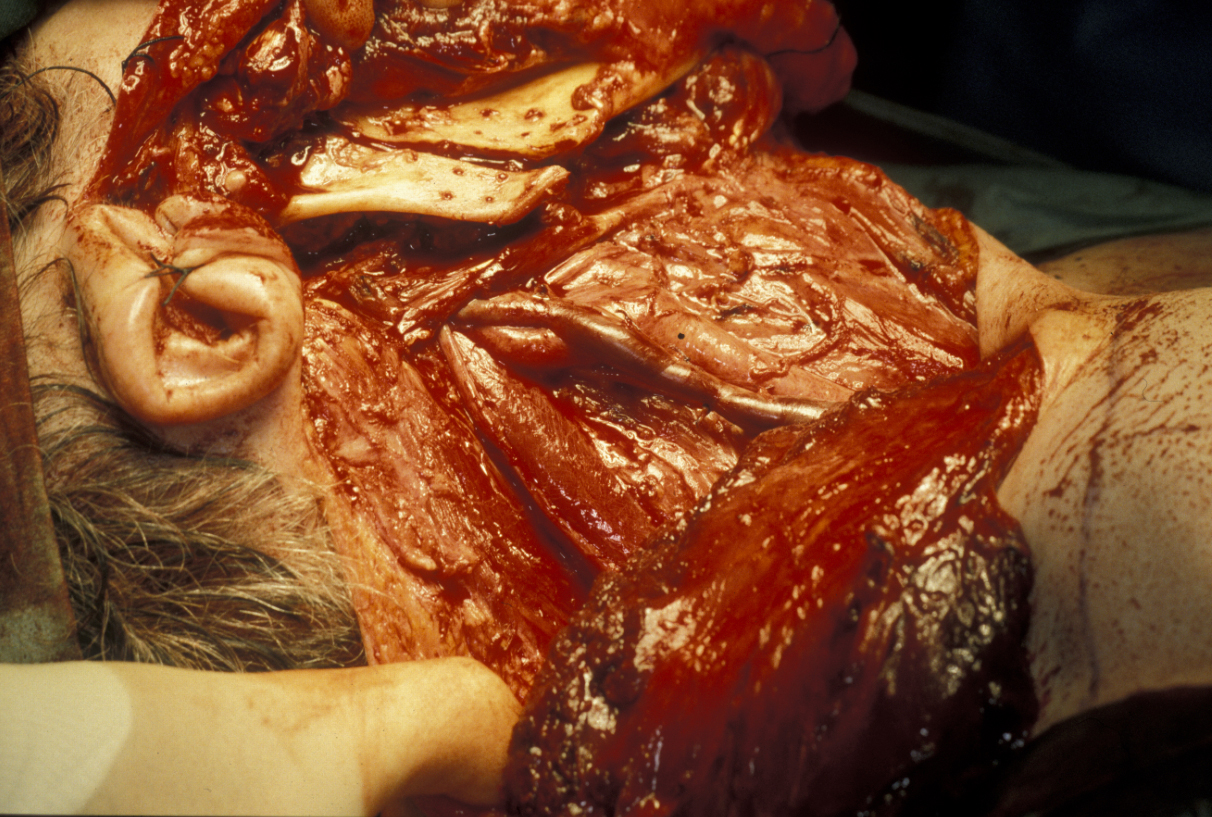 Submandibular gland excision is required after the gland has suffered irreparable damage from infection and/or obstructive disease. The surgical approach is by trans-cervical (from the neck) approach. The incision is two finger-breadths below the lower border of the mandible. A 3 to 4 cm incision is made. The incision is then deepened through fat that bleeds; bleeding needs to be controlled using bipolar diathermy to expose the platysma muscle (a broad sheet of muscle covering front and sides of the neck; see Figure 5).