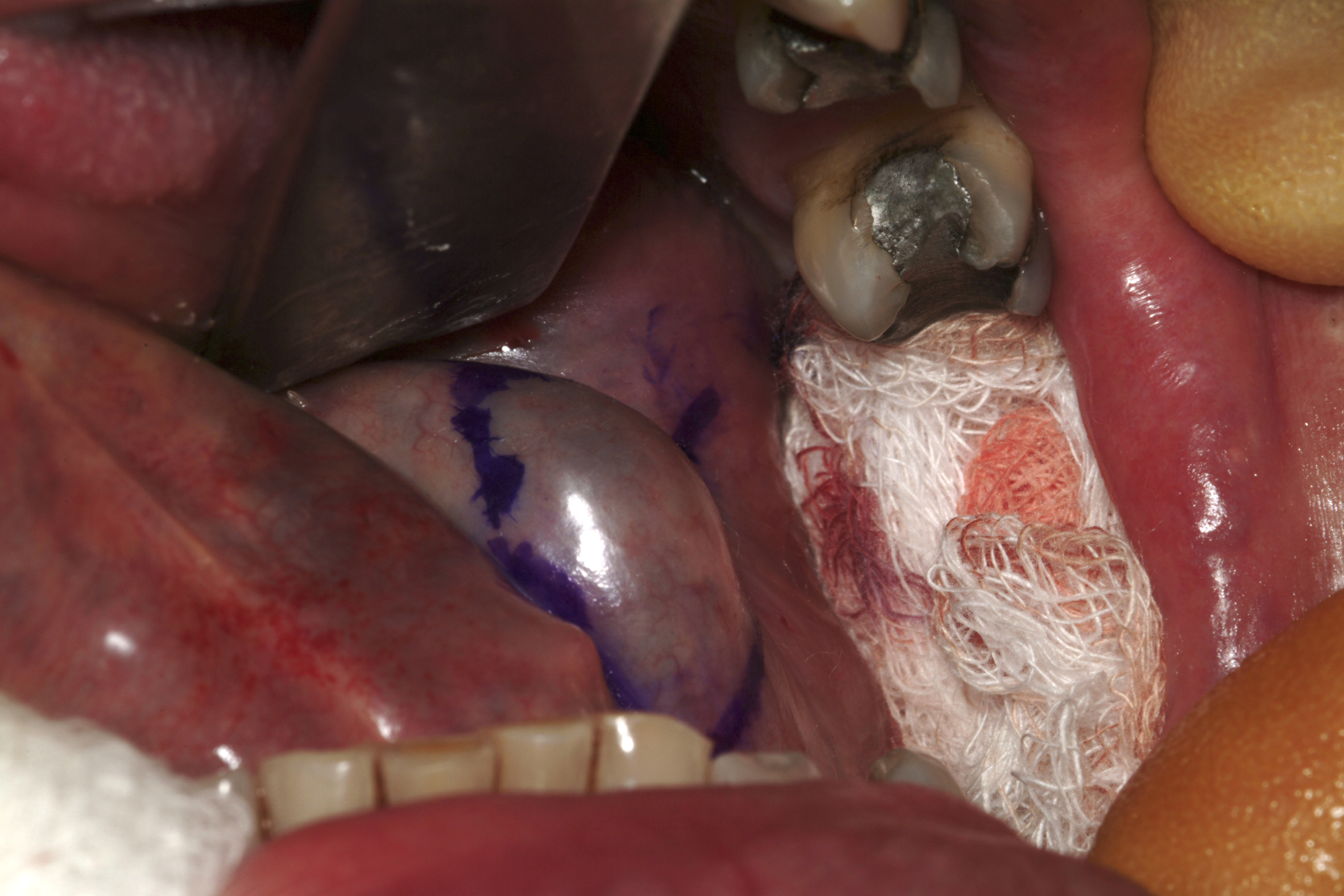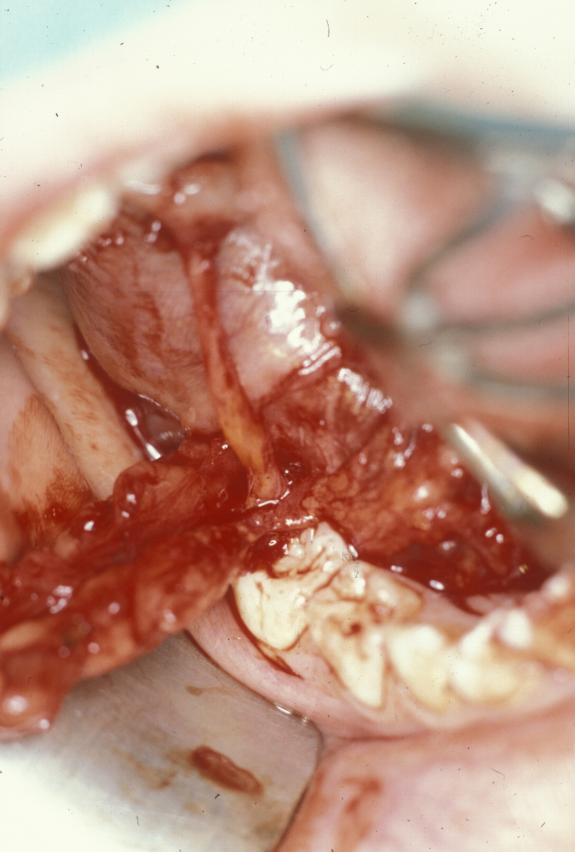 The intact ranula can then be dissected by a combination of scissors and swabs. The sublingual gland is identified as it envelopes the submandibular duct and is excised. The remnants of sublingual gland closest to the submandibular gland are often difficult to identify and to separate completely. It may be necessary to leave small remnants of sublingual gland tissue in the area. Obvious residual sublingual gland tissue should be cauterised to minimise leakage of saliva. Adequate haemostasis should be ensured at this point because postoperative bleeding can be a real problem.