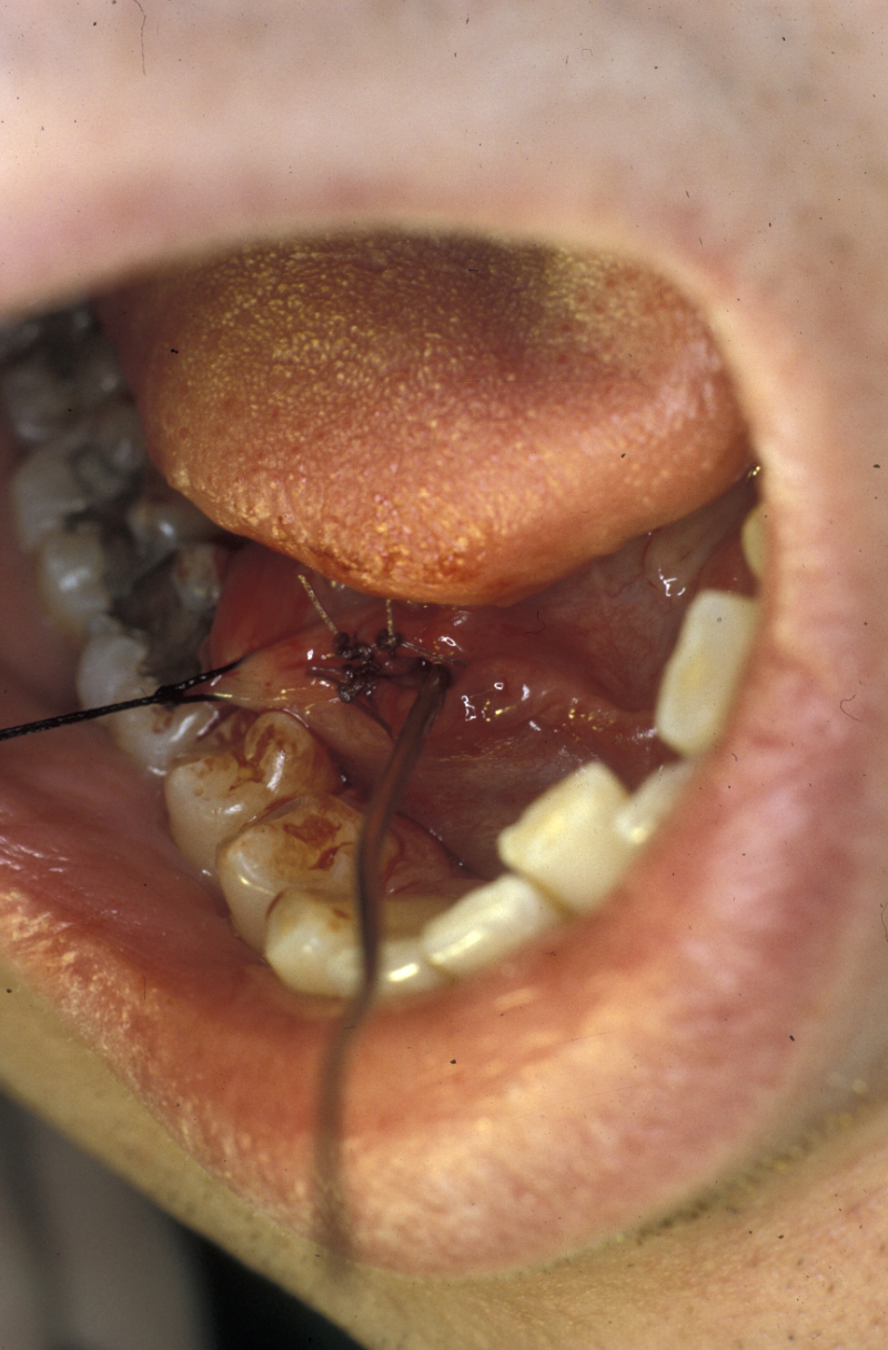 Calculi of the salivary glands may be dealt with in several ways. In the submandibular gland, if the calculus is visible in the duct on an X-ray radiograph and is relatively anterior (to the front) and palpable, it may be removed using local anaesthesia in a procedure called transoral sialolithotomy. The area is infiltrated with a local anaesthetic agent, and a stay suture is placed beneath the duct proximal (near) to the palpable calculus (see Figure 4).