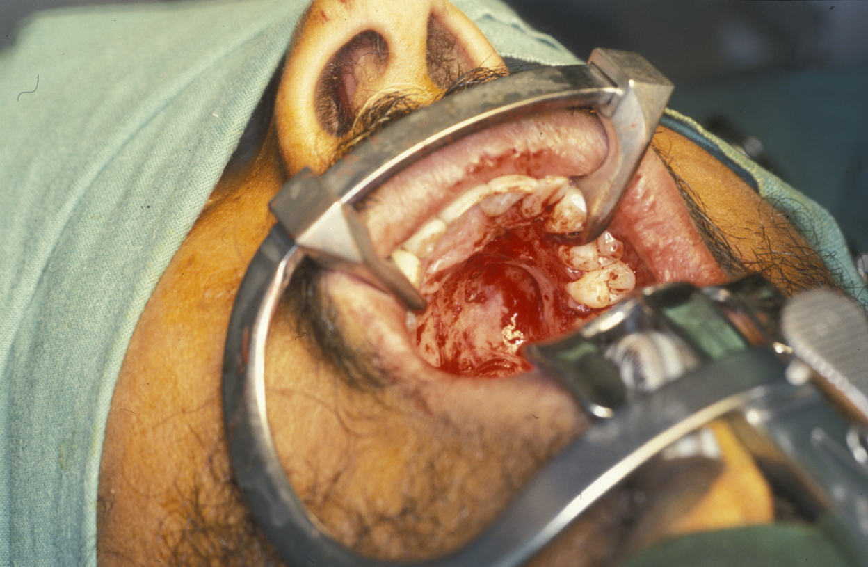 For all tumours which overlay the hard palate, simple subperiosteal excision with a mucosal margin is adequate (see Figure 8). Healing by secondary intention (leaving the wound as is) of the palate is excellent and can be achieved by using a dressing plate with a sedative and soothing dressing. If the tumour extends into the soft palate, the capsule of the tumour can be elevated from the underlying levator aponeurosis (a thin structure that connects the levator muscle (the muscle responsible for lifting up the soft palate when saying ‘ahhh’) . The soft palate defect will granulate with good functional result. If the levator aponeurosis is breached, however, this has to be repaired and should be reconstituted with vascularised tissue, such as a buccal fat pad flap, or a temporoparietal fascial flap.