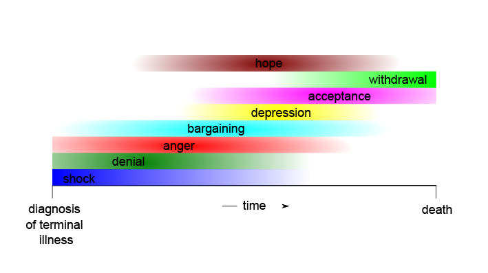 Some 50 years ago, the psychologist Elisabeth Kübler-Ross collated a large number of terminally ill patients’ discussions and reflections about death and dying (patient-centred research was quite revolutionary at that time). She summarised the overall trends from this rich material about death and dying as five ‘stages’ of grief (as a slightly artificial and overlapping set of categories, however, highlighting that the experience of dying is not solely one of grief), with some common patterns of developments over time (Figure 1).